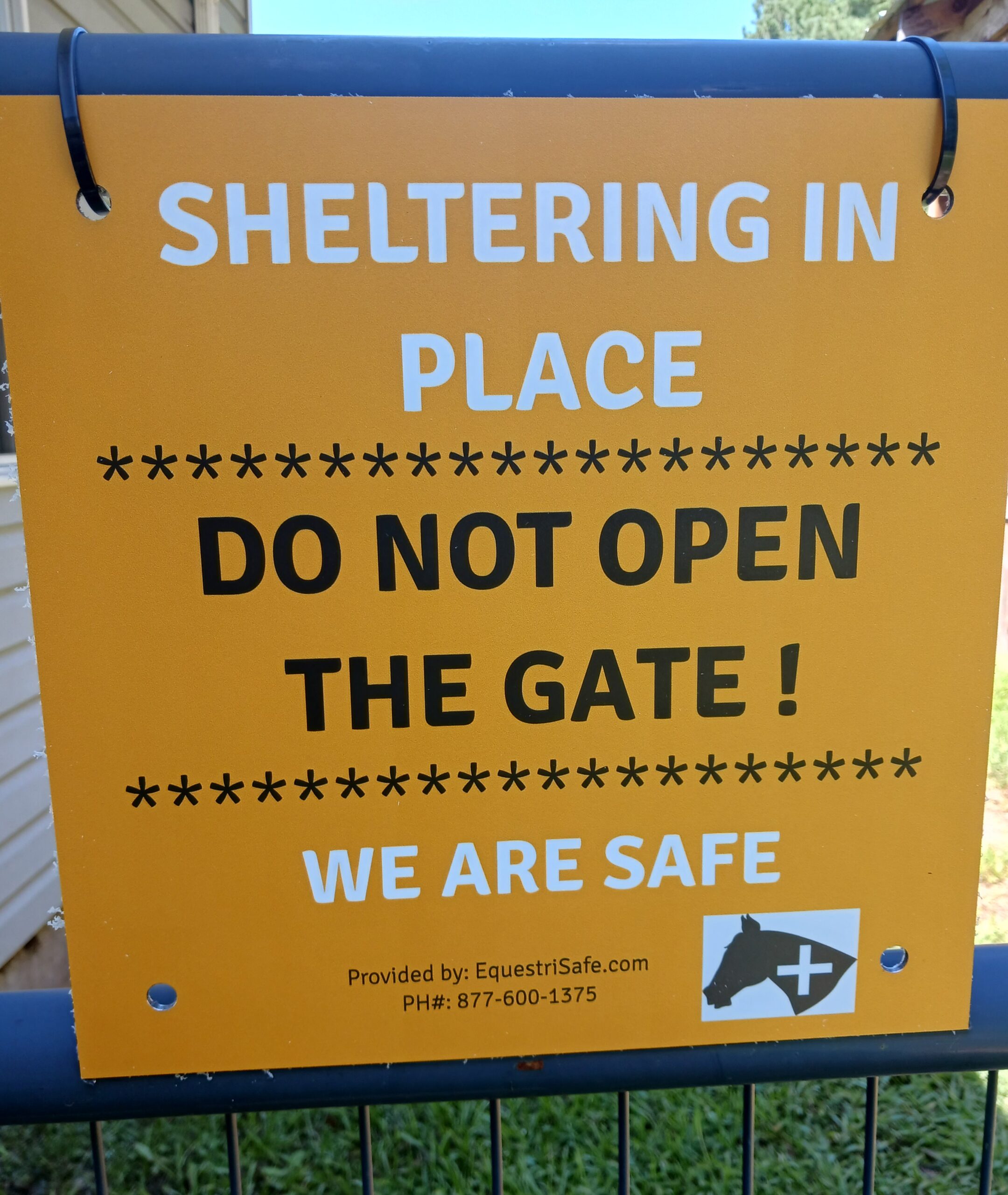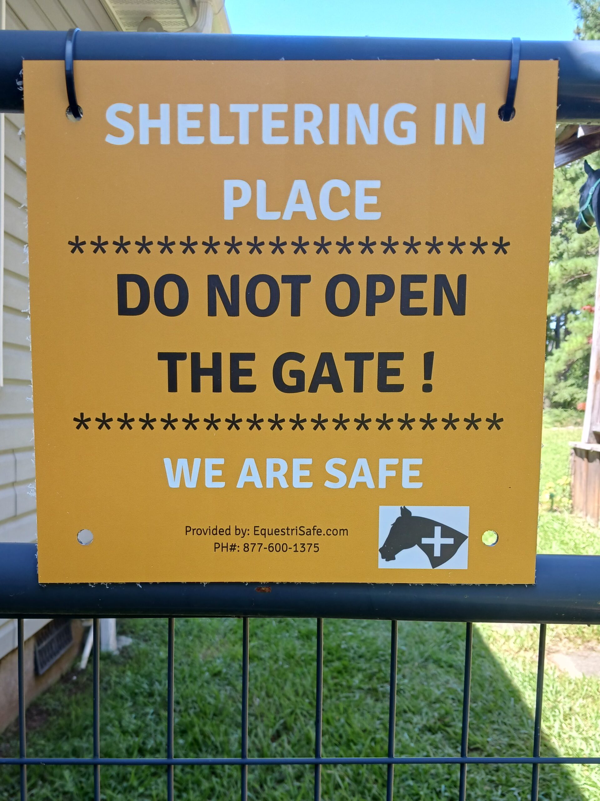 When seconds count and visibility matter, the EquestriSafe Shelter in Place sign ensures your property is clearly marked for emergency responders during wildfire or disaster events. Designed specifically for agricultural settings, this sign communicates a critical message: “Sheltering in Place – Do Not Open the Gate!”, durable, high-visibility —specifically designed for agricultural settings like farms and ranches.